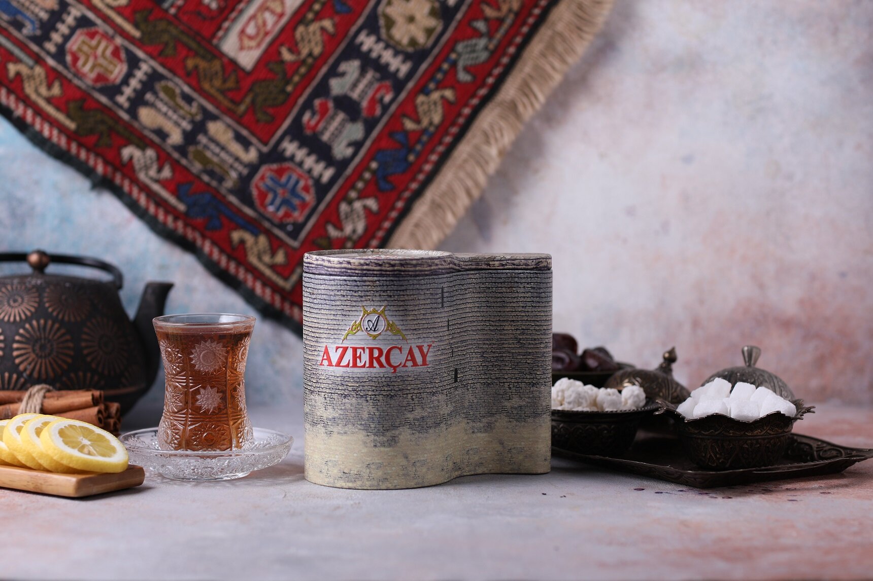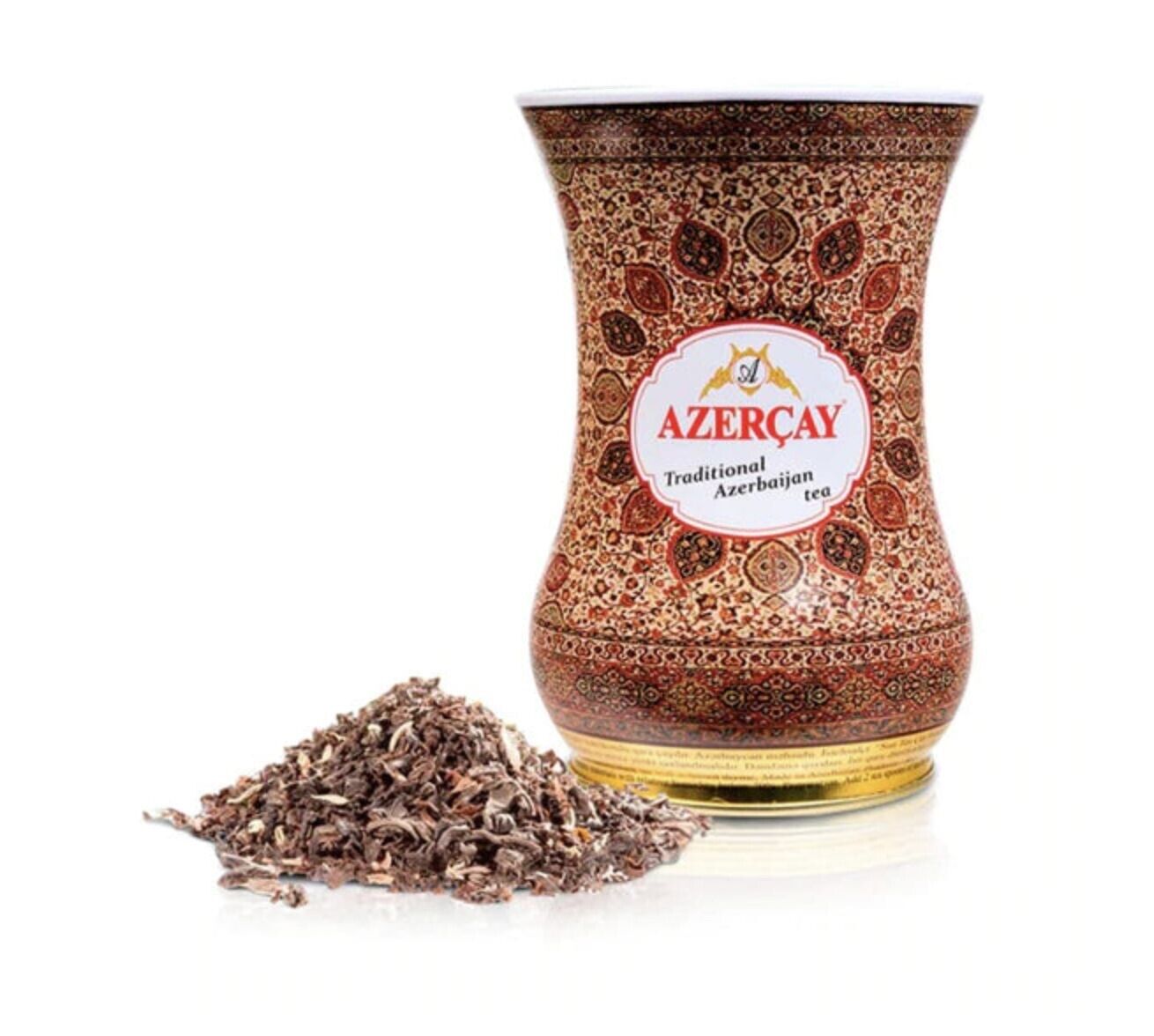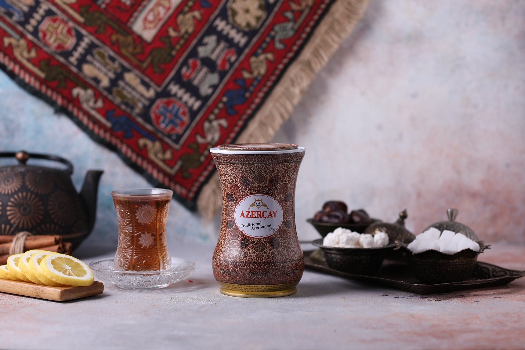 Authentic Azerbaijani tea in stunning carpet-patterned packaging. A beautiful collector's item that captures the essence of Caucasian culture.